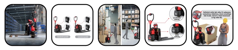 - Samotný F4 je nejflexibilnějším vozíkem v celé sérii F díky svým konfiguracím. Díky konstrukci se dvěma sloty pro baterie je univerzálním pomocníkem, který zvládne různé typy nasazení – od příležitostného použití až po dlouhé pracovní směny.