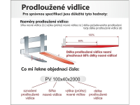 Prodloužení vidlic pak slouží k manipulaci s delšími nebo rozměrnými náklady. Označení např. PV 100x40 označuje rozměr nosné vidle, vnitřní rozměr prodloužení je optimalizovaný pro snadnou montáž a demontáž. Prodloužení je vyrobeno také z kvalitní oceli s vysokou odolností vůči ohybu a opotřebení. Snadná montáž probíhá pouhým nasunutím na vidli a zajištěním čepem a bezpečnostní pojistkou. Prodloužení vidlic výrazně rozšiřuje možnosti manipulace a zvyšuje flexibilitu provozu. Nosná vidlice by měla tvořit 60 % délky prodloužení, aby byla zachována bezpečnost provozu. Všechny vidlice na VZV v naší nabídce jsou v souladu s platnými bezpečnostními předpisy pro manipulaci s materiálem.